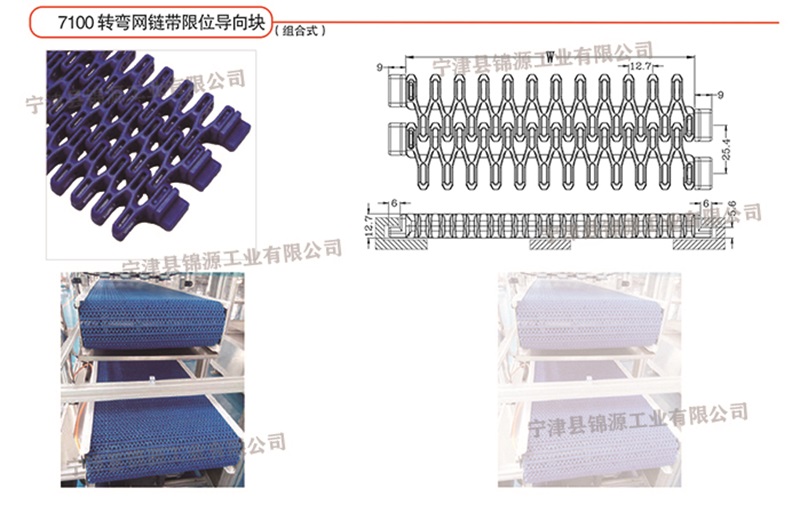 7100型轉(zhuǎn)彎網(wǎng)帶 開孔、平板、凸筋、滾珠、防滑形式,解決皮帶不跑偏,更換難等問題。